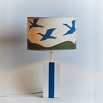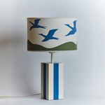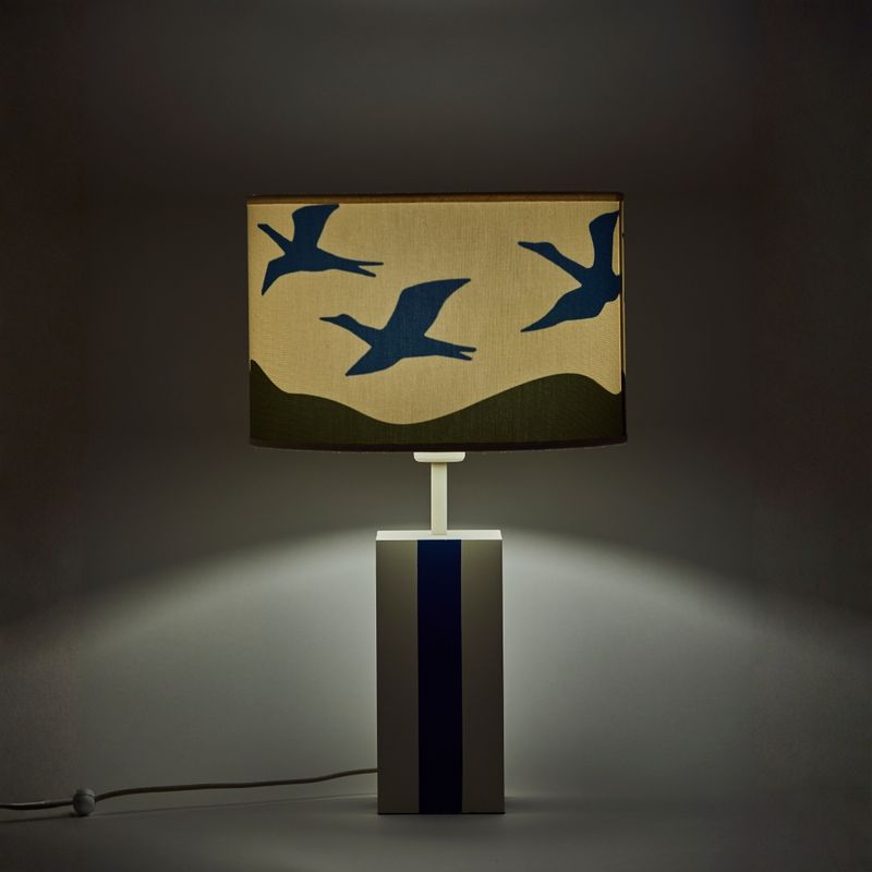 O Comporta P é uma peça da collab La Lampe + Mobiletti, unindo design autoral e estamparia exclusiva. Seu corpo é produzido em alumínio com pintura lisa, apresentado na combinação marcante das cores Bege Baunilha SR e Uniforme Escolar da Suvinil, que adiciona personalidade e destaque ao ambiente.