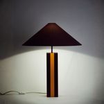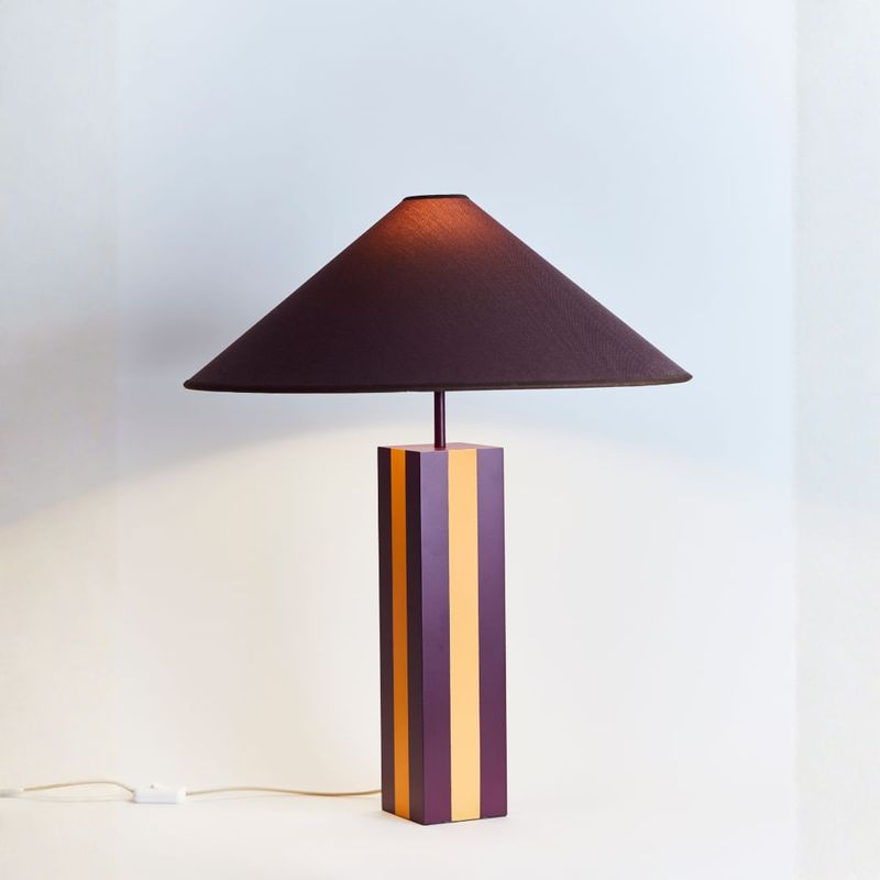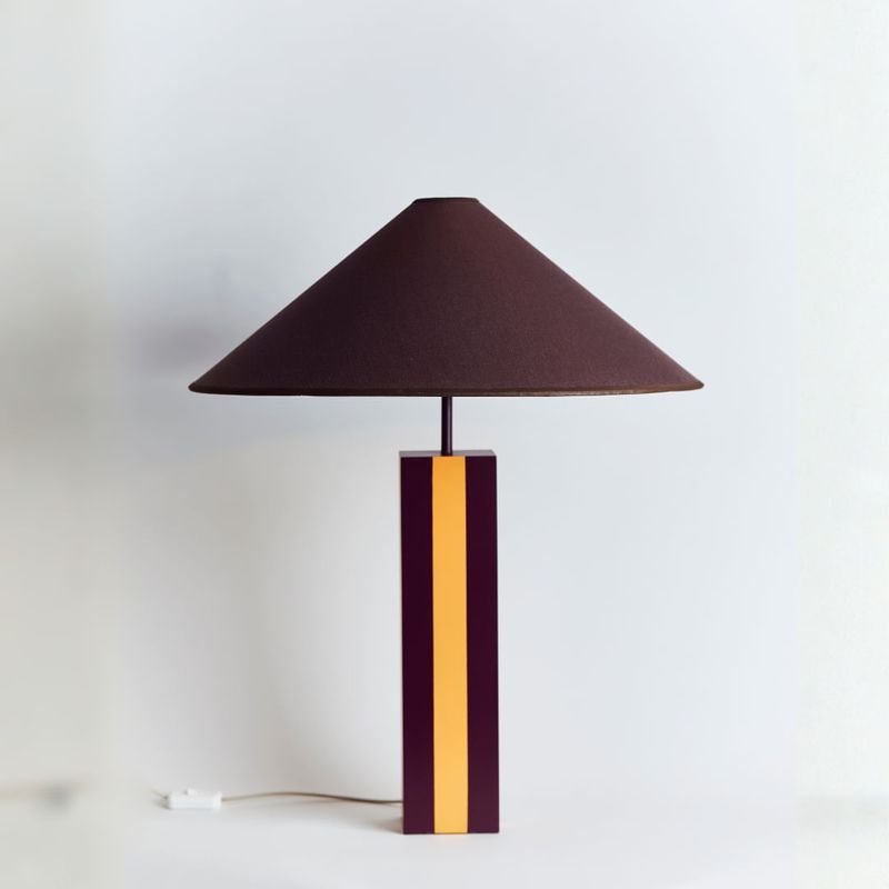 O Tulum G é uma peça da collab La Lampe + Mobiletti, unindo design autoral e estamparia exclusiva. Seu corpo é produzido em alumínio com pintura lisa, apresentado na combinação marcante das cores Roxo Profundo e Folhas de Outono da Suvinil, que adiciona personalidade e destaque ao ambiente.