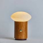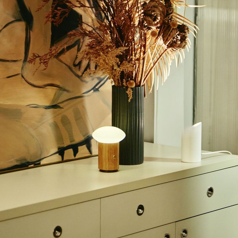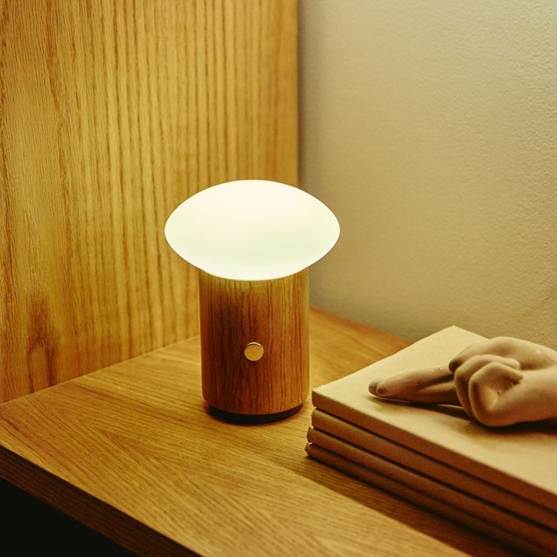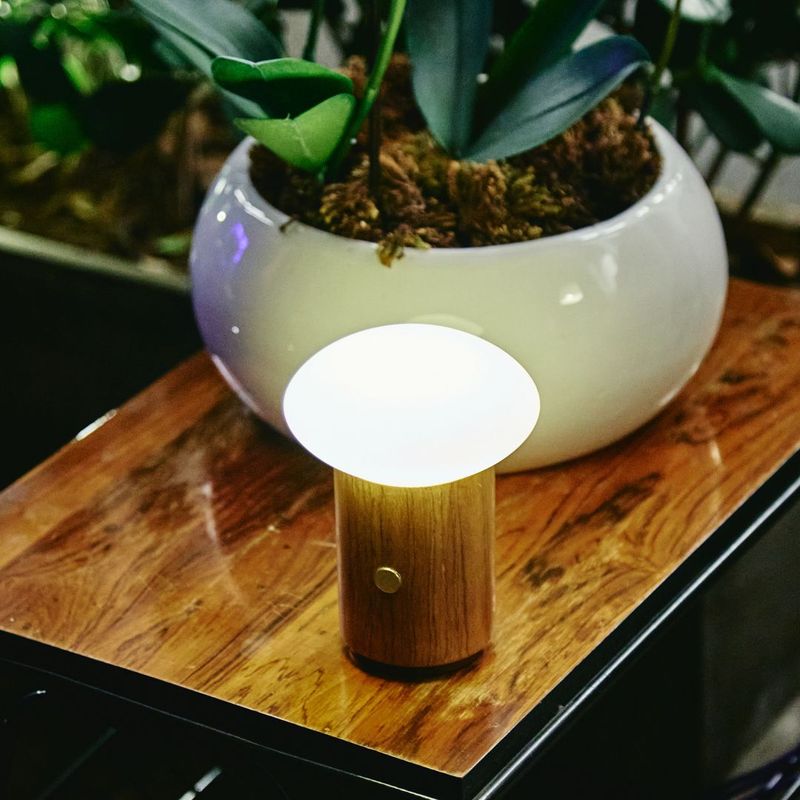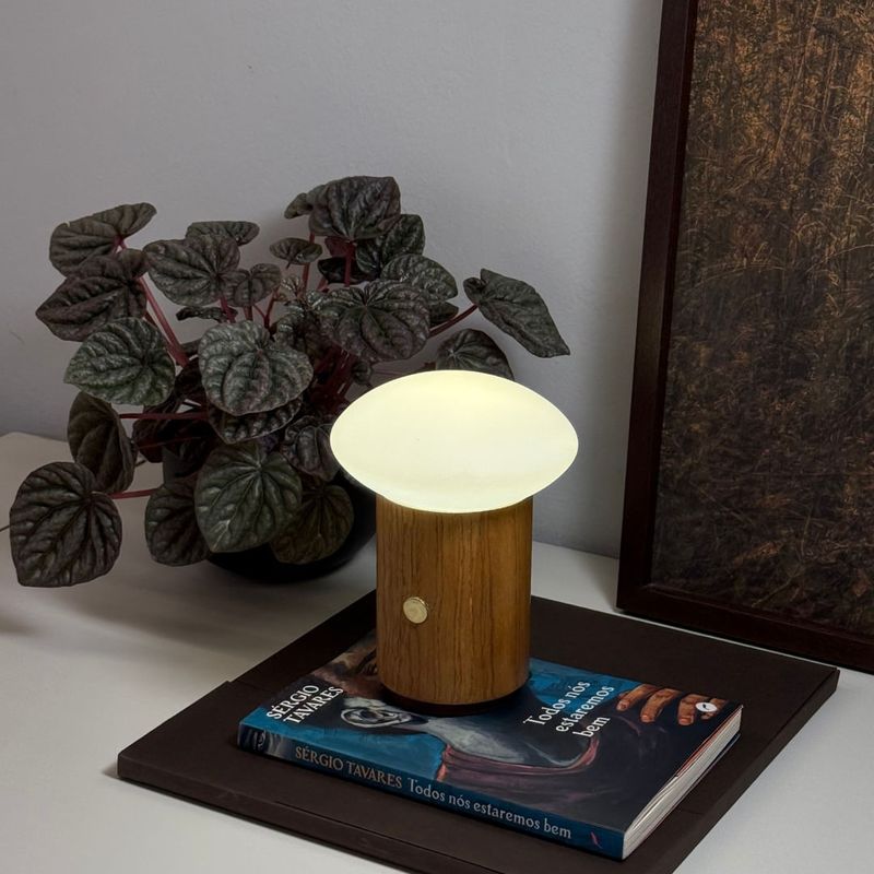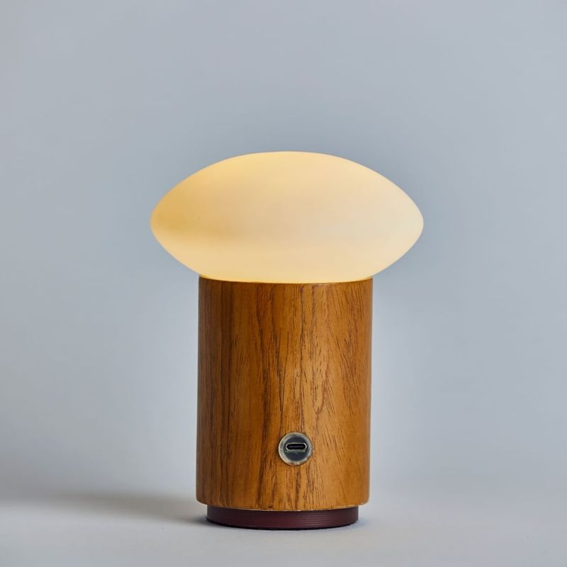 A Luminária de mesa portátil e recarregável Yume combina tecnologia e design em uma peça portátil e elegante. Sua estrutura em alumínio revestida em madeira Freijó traz um toque natural e acolhedor, enquanto a cúpula de vidro oval leitoso difunde a luz de forma suave e equilibrada.