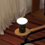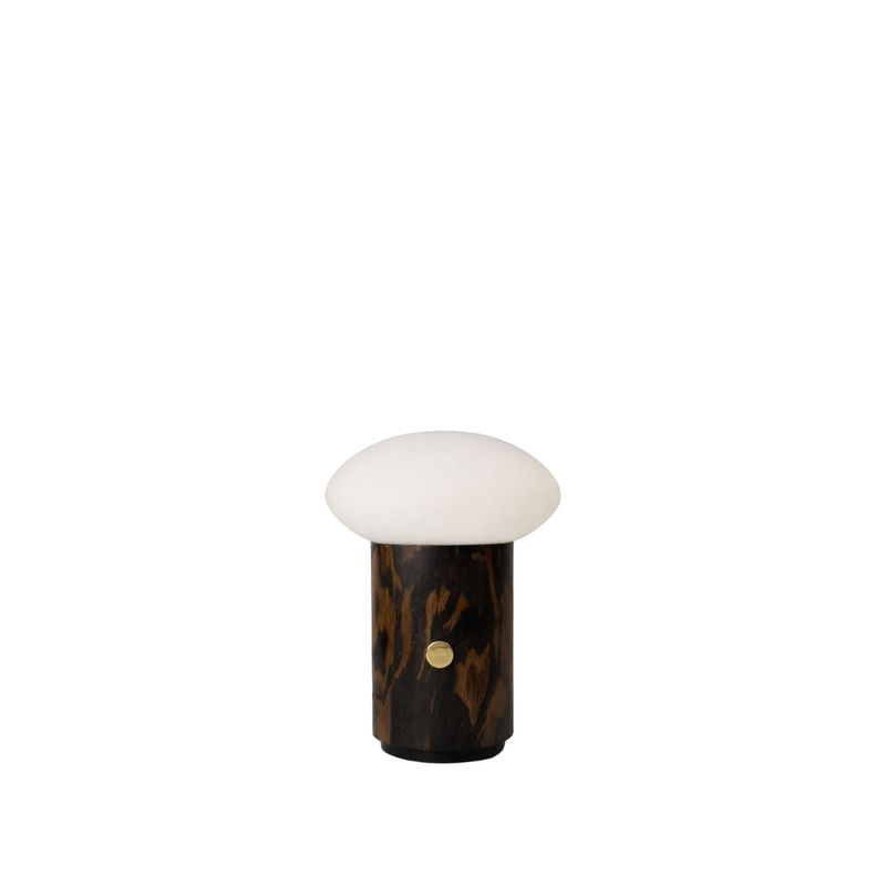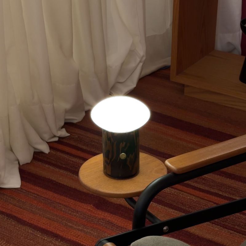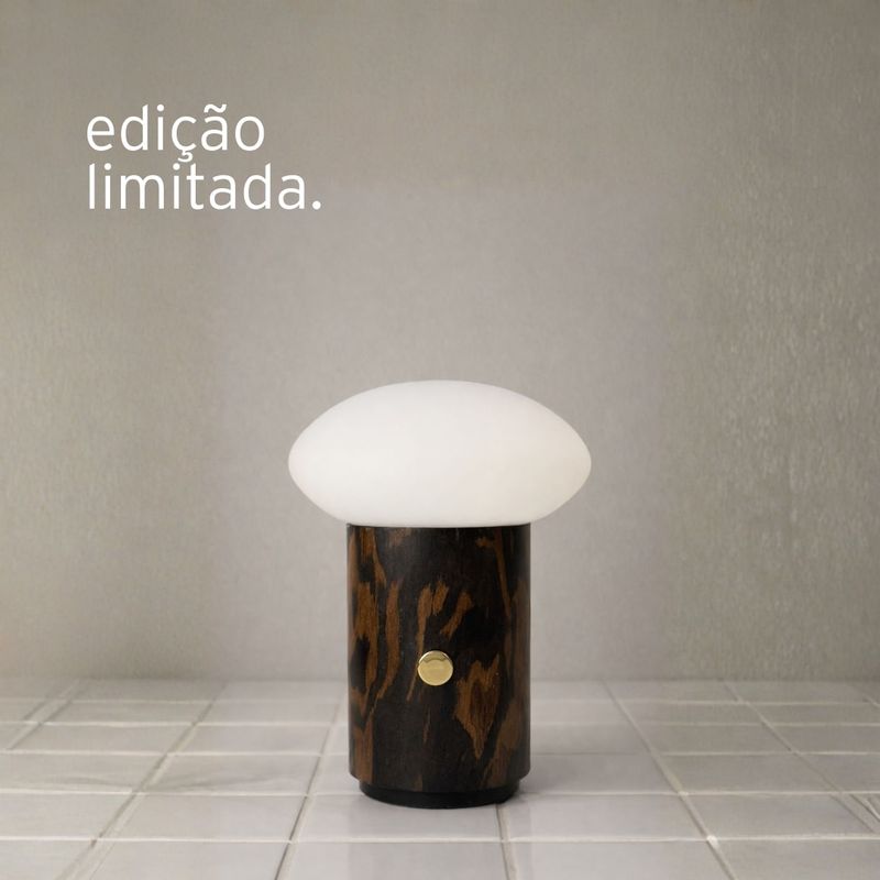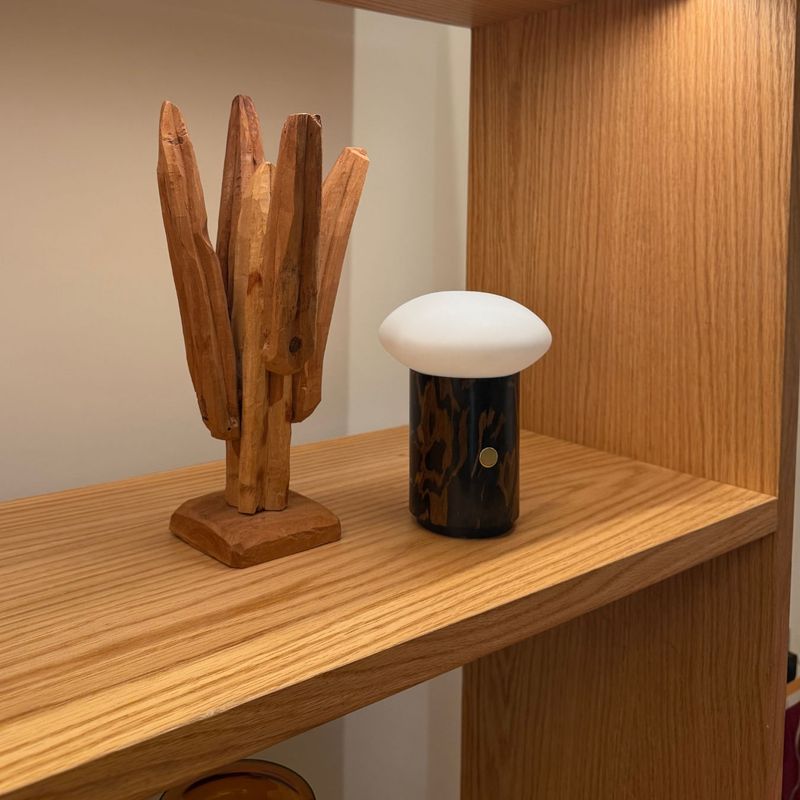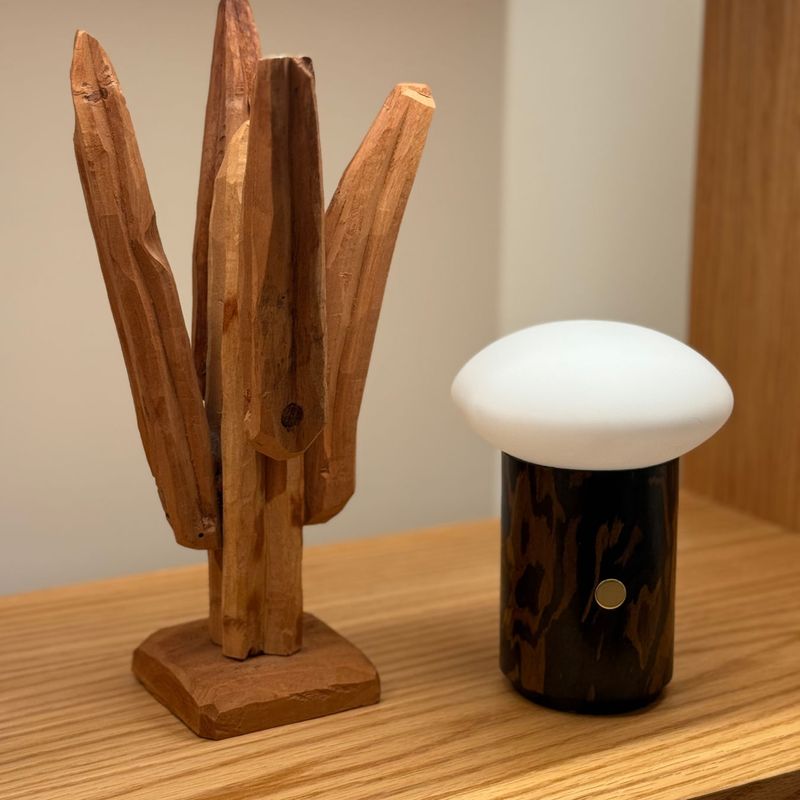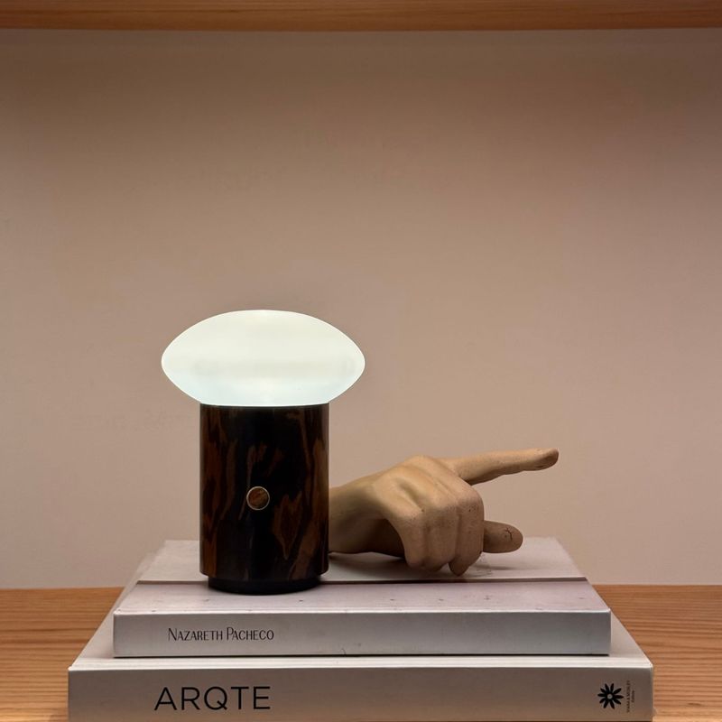 A Luminária de mesa portátil e recarregável Yume combina tecnologia e design em uma peça portátil e elegante. Sua estrutura em alumínio revestida em madeira Freijó traz um toque natural e acolhedor, enquanto a cúpula de vidro oval leitoso difunde a luz de forma suave e equilibrada.