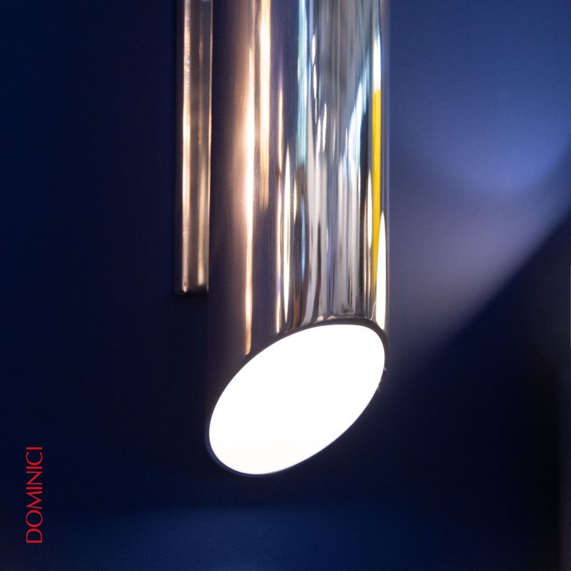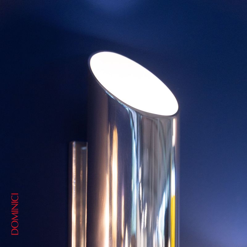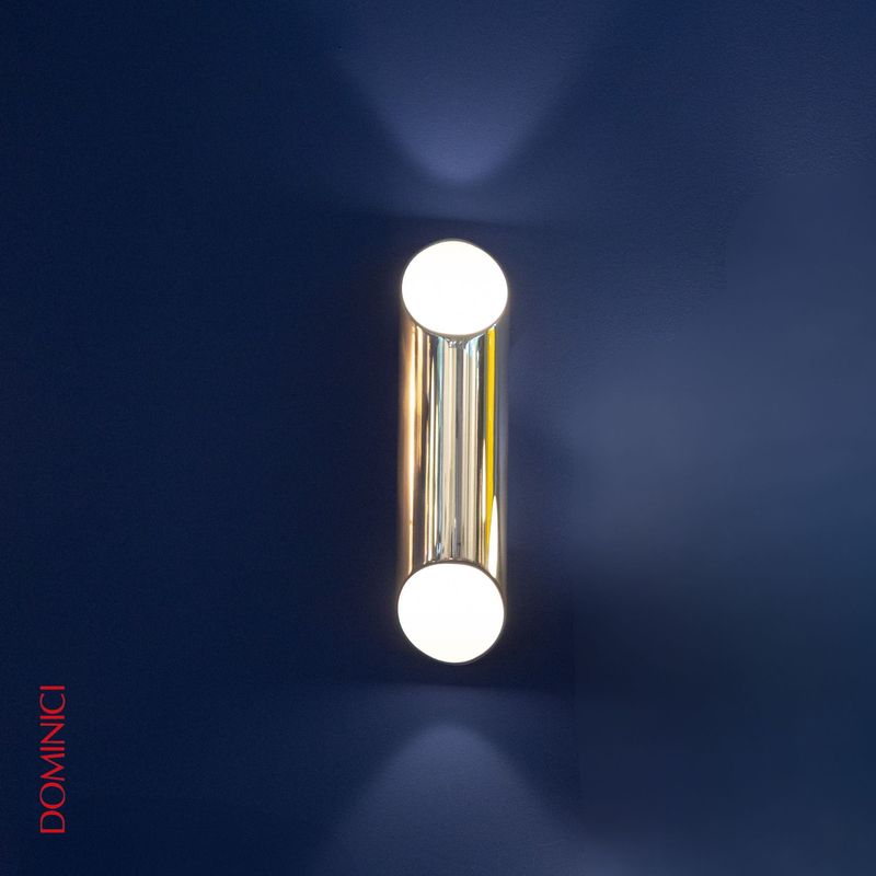 A Arandela Tubo possui um design minimalista e atemporal. Com sua estrutura cilíndrica em aluminio polido com acabamento em verniz brilho, a peça proporciona iluminação bidirecional — para cima e para baixo — criando um efeito luminoso marcante e sofisticado.