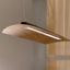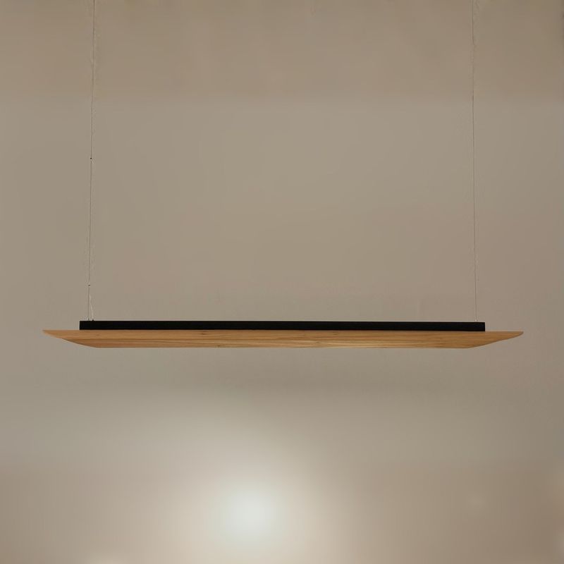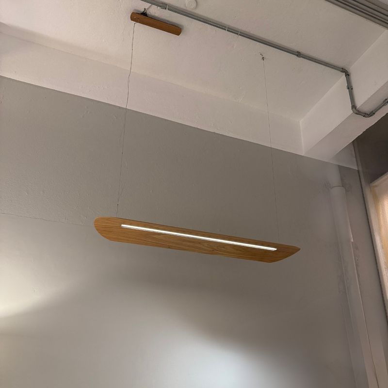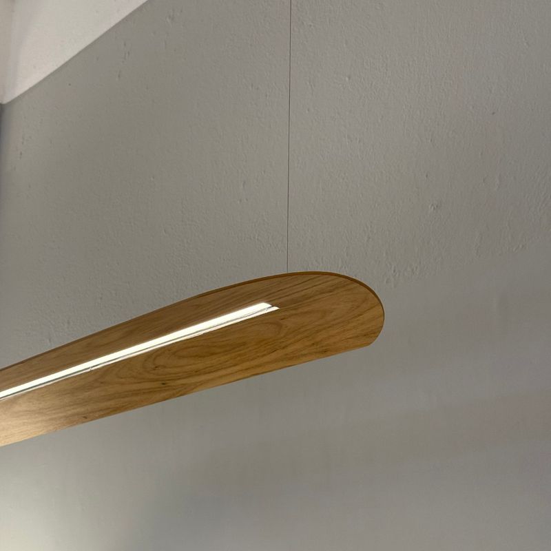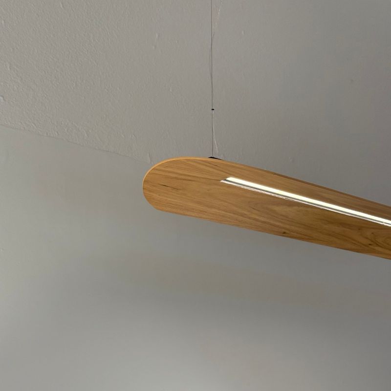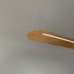 O Lustre Ollie possuí linhas contínuas e uma curvatura delicada. Seu corpo em alumínio é revestido por lâmina de madeira freijó, revelando uma superfície orgânica.